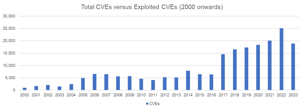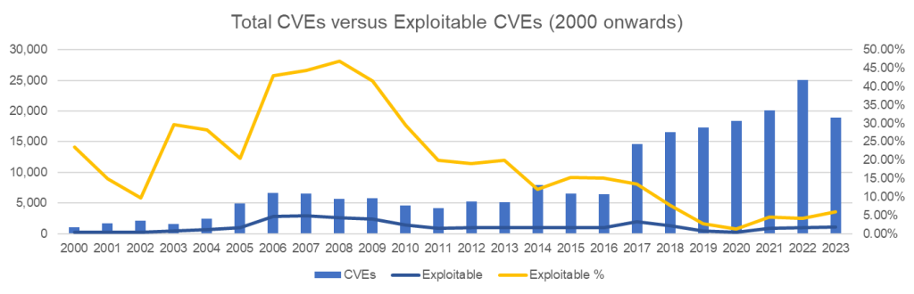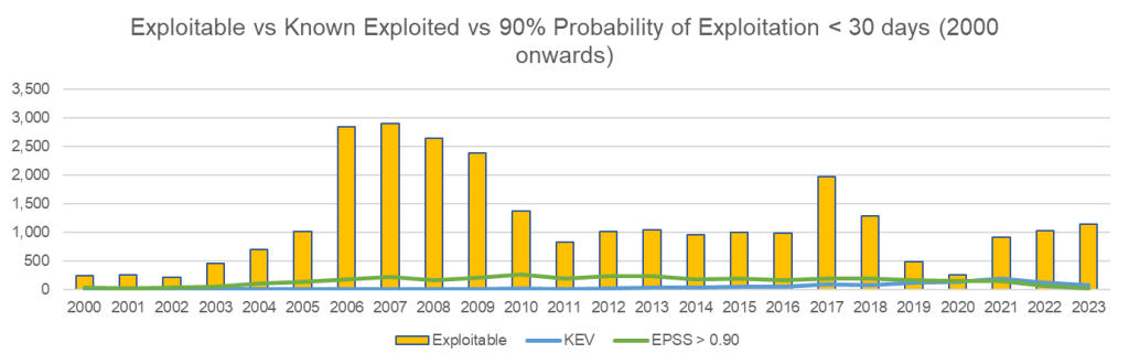 | Year | Total CVEs | Exploitable | KEV | EPSS > 0.90 |